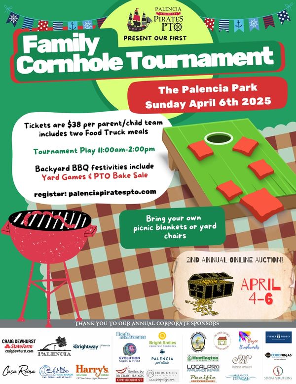Join us for a parent / child cornhole tournament at the Palencia Park! Tournament play is from 11:00 am - 2:00 pm. There will be backyard BBQ festivities including yard games and a PTO bake sale. Register today to purchase tickets for $38 per parent / child team which includes two food truck meals!